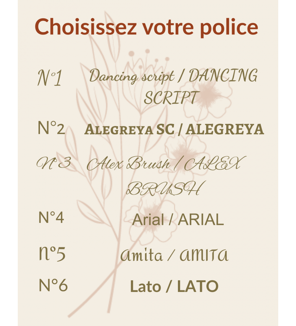 Merci d’indiquer votre texte et vos souhaits (motif, police, etc.) dans la zone de personnalisation au moment de la commande.